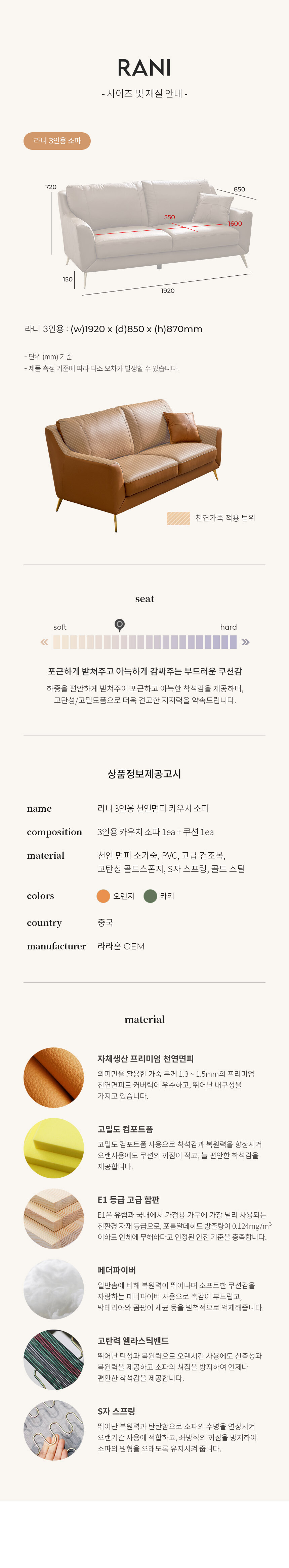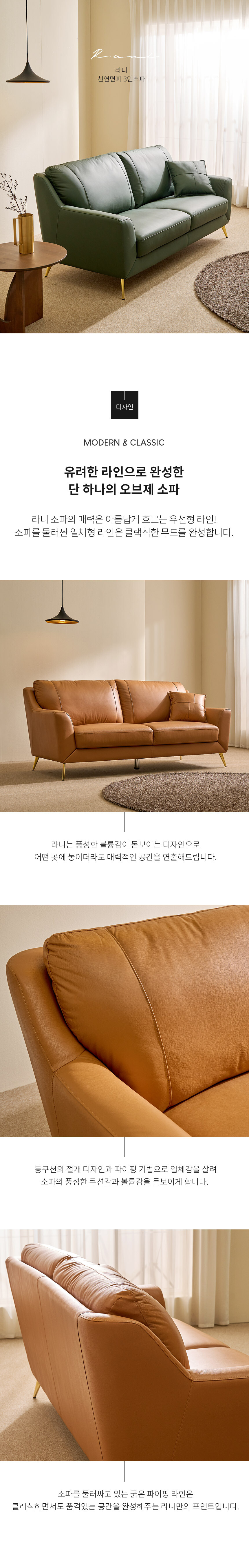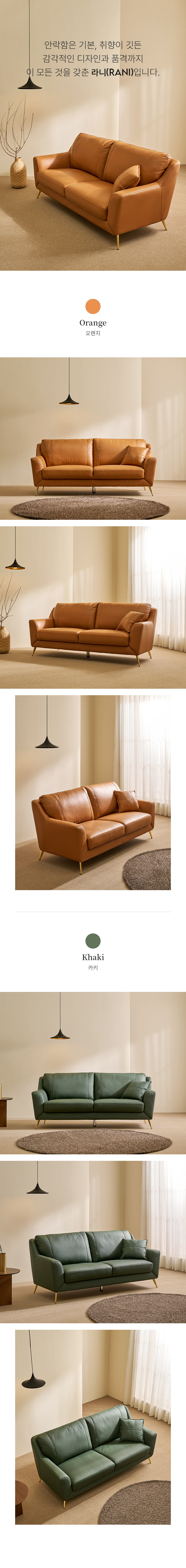 라니 3인용 천연면피 오렌지 카키 소가죽 가죽 소파