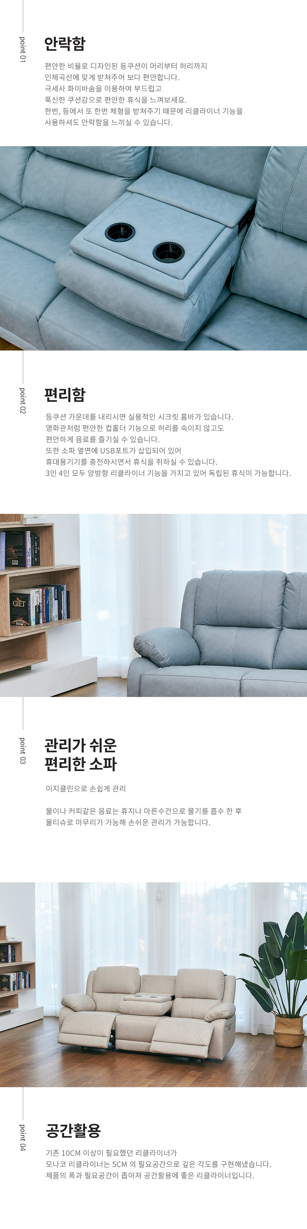 내몸에 맞는 리클라이너 기능으로 거실에서도 안락하고 편안한 자세로 편안한 휴식을 취해보세요.