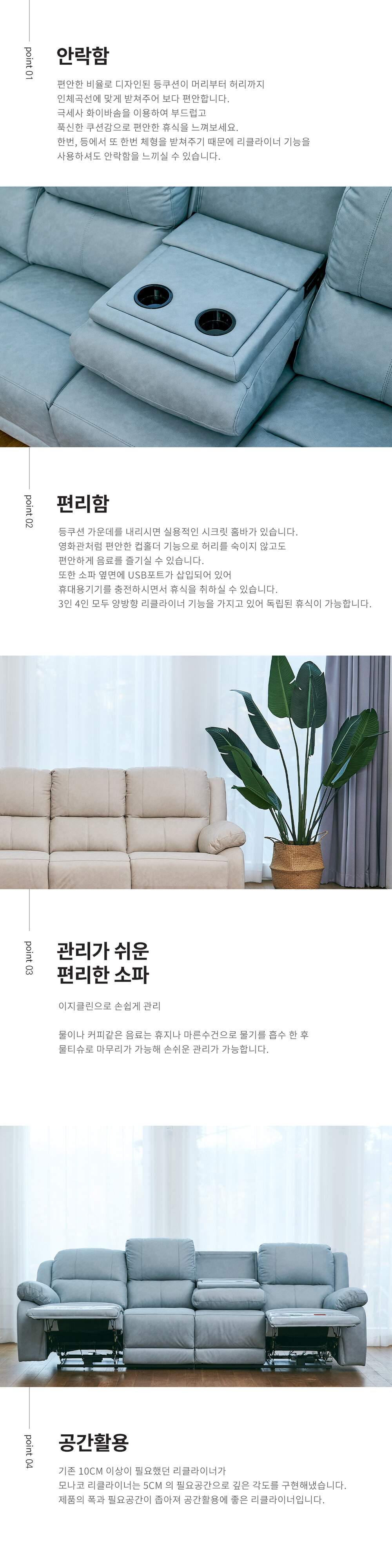 내몸에 맞는 리클라이너 기능으로 거실에서도 안락하고 편안한 자세로 편안한 휴식을 취해보세요.